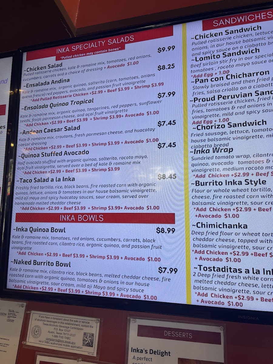 Flour tortilla, cilantro rice, black beans, melted cheddar cheese, fire roasted corn with organic quinoa, onions and tomatoes in a house balsamic vinaigrette, sour cream, mild aji mayo and spicy huacatay sauce