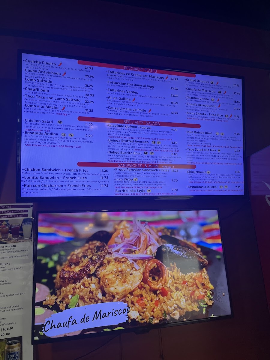 Peruvian fried rice, garlic, green onions, red peppers, eggs, gluten free soy sauce, with a mix of seafood. Octopus, calamari, shrimp, clams, and mussels. Topped with sarza criolla