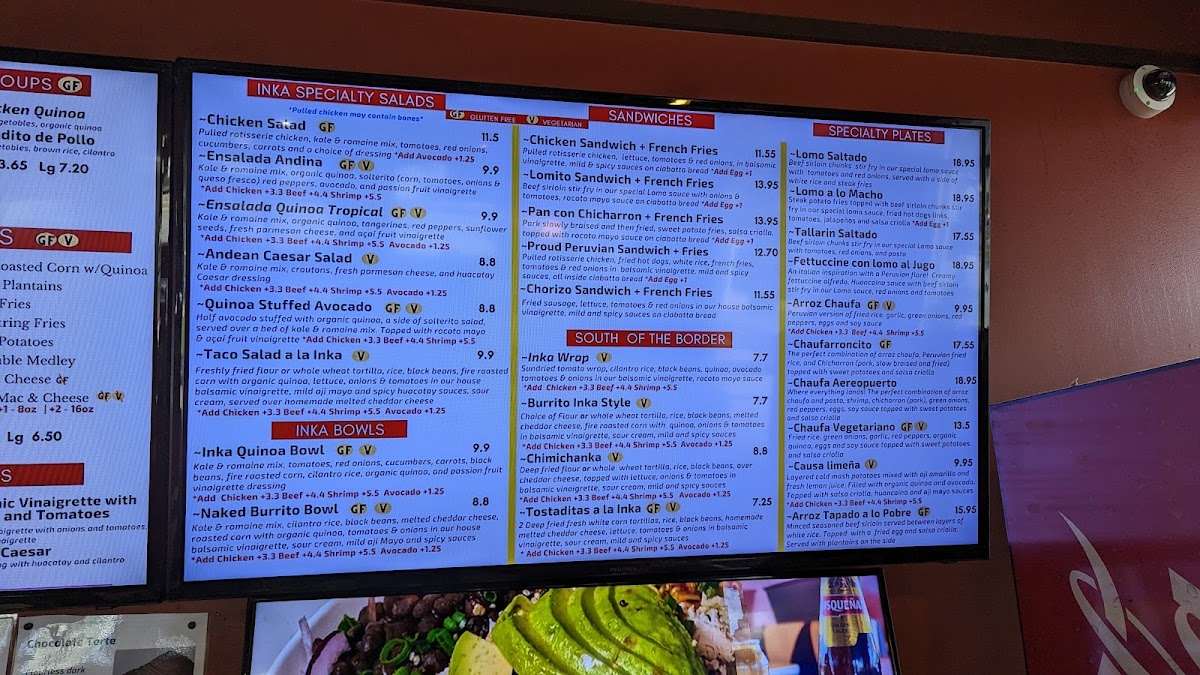 Kale & romaine mix, cilantro rice, black beans, melted cheddar cheese, fire roasted corn with organic quinoa, onions and tomatoes in a house balsamic vinaigrette, sour cream, mild aji mayo and spicy huacatay sauce